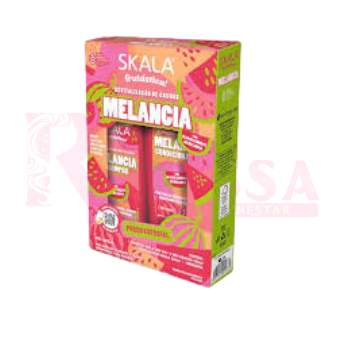 El Pack Shampoo y Acondicionador Melancia Skala está formulado con extracto de sandía (melancia), un ingrediente natural conocido por sus propiedades hidratantes y refrescantes. Este pack de cuidado capilar limpia suavemente, mientras nutre y revitaliza el cabello desde la raíz. El shampoo elimina impurezas sin resecar, dejando el cabello fresco, mientras que el acondicionador proporciona hidratación intensa, suavidad y brillo. Ideal para cabellos secos o dañados, este pack ayuda a mantener el cabello suave, saludable y con un aroma delicioso a sandía, dejándolo más manejable y lleno de vitalidad.